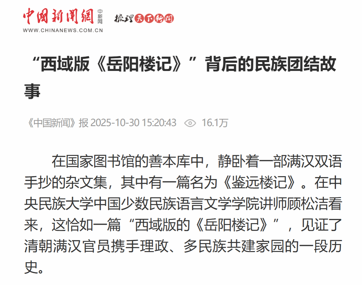(全文转自中国新闻网平台,请浏览全文请点击右侧链接“西域版《岳阳楼记》”背后的民族团结故事)[详情]