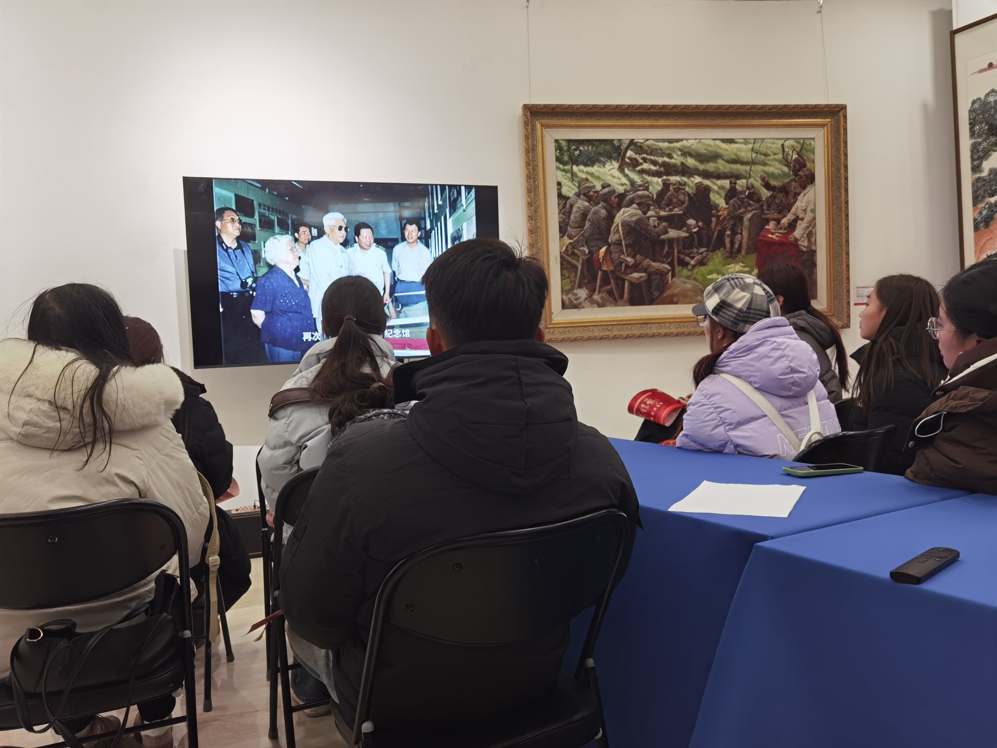 七师分会副会长、原新四军七师副政委兼政治部主任李步新之女李晓帆女士全程为同学们讲解画作的历史故事。观展后,双方召开了简短的座谈会,同学们还观看了两部分别讲述征战一生的张铚秀将军、新四军皖南游击队的创建者胡明先生的纪录片。