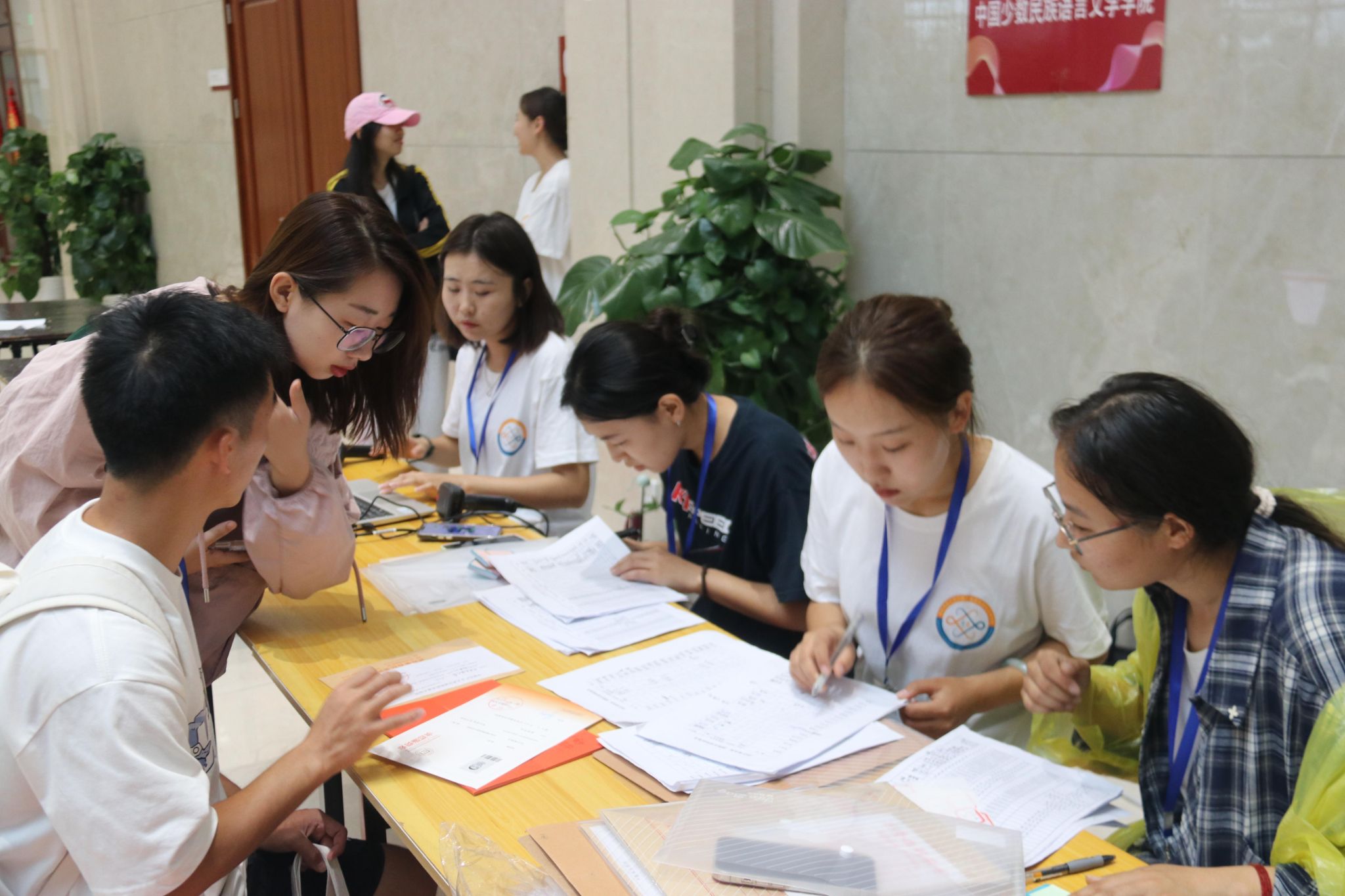 信息录入处,学姐在为萌新们办理入学手续、发放校园卡与开学大礼包等。