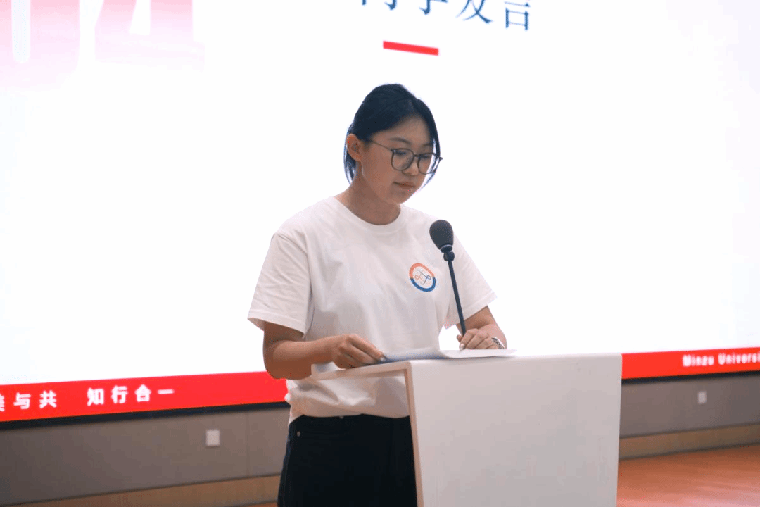 研究生新生代表谭芮、本科生新生代表谭淑予分别以“从‘旧人’到‘新人’,坚守传承与担当”“承文化记忆,启大学新程”为题,分享自己对民大、少语以及中华文化的热爱。她们也一致表示要发挥自身专业优势,积极参与社会实践,以中华民族语言文学为媒,传播中国之声,诠释民大人刻在骨子里的“美美与共、知行合一”的校训精神。