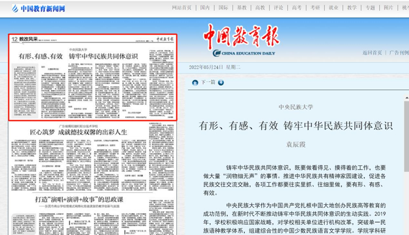5月24日,《中国教育报》刊发了猫都论坛 党委副书记袁辰霞撰写的《有形、有感、有效铸牢中华民族共同体意识》一文。