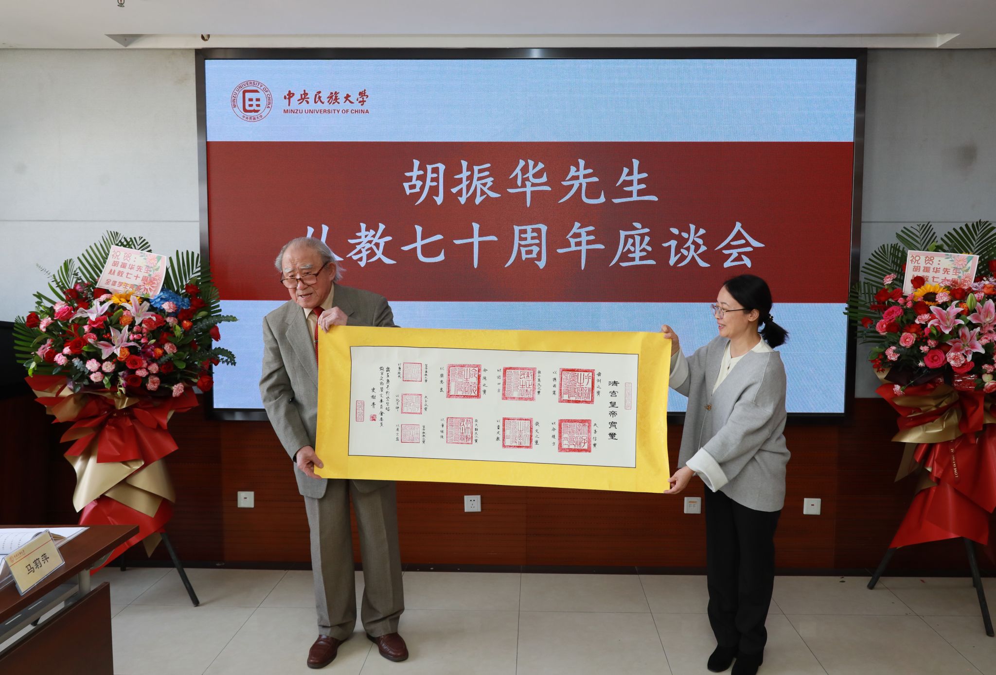 此次座谈会旨在祝贺学校荣誉资深教授胡振华先生从教七十周年,是学校尊师重教的具体体现,不仅是对胡振华教授辛勤耕耘七十年的赞颂和感谢,也鼓舞着一代又一代民大师生传承薪火,为传承和弘扬中华优秀传统文化,促进各民族交往交流交融贡献力量。