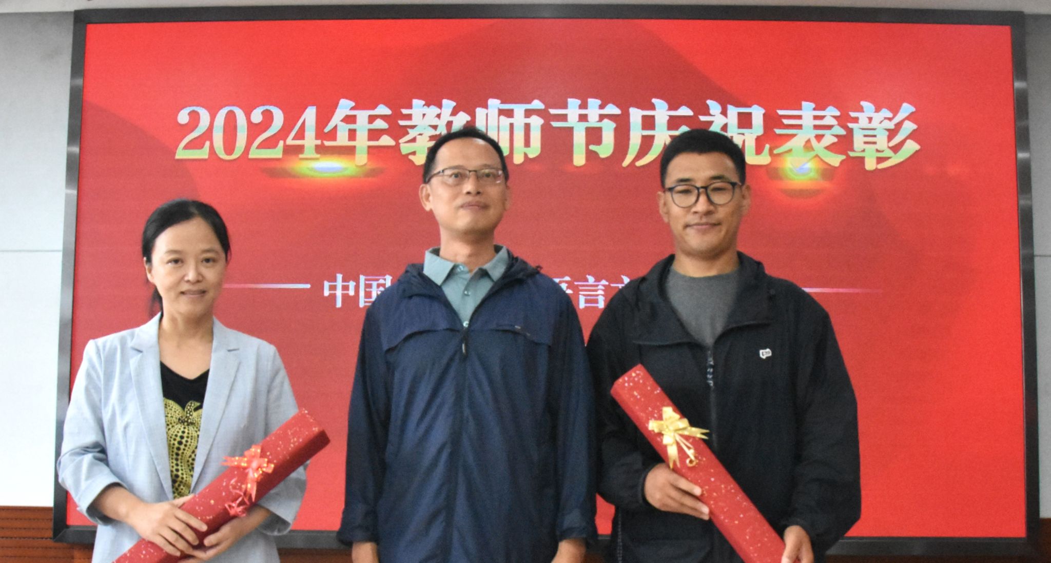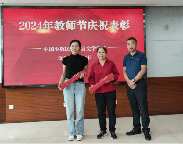 领导、党委委员、教授委员会和教代会委员分别为获得国家一流本科课程、国家通用语言文字推广普及先进个人、北京高校优质课程、北京市大学生人文知识竞赛突出贡献奖、北京市优秀学位论文指导教师,参加上级单位各类工作和学校外派培训工作等方面表现优秀的教师颁发证书。