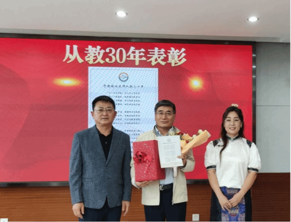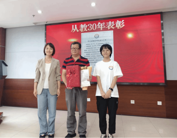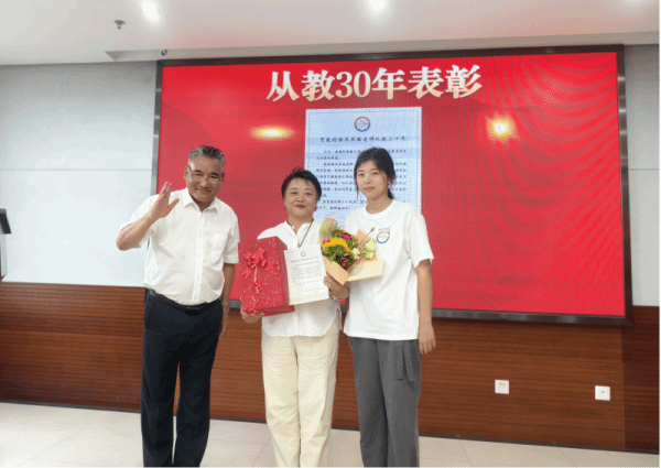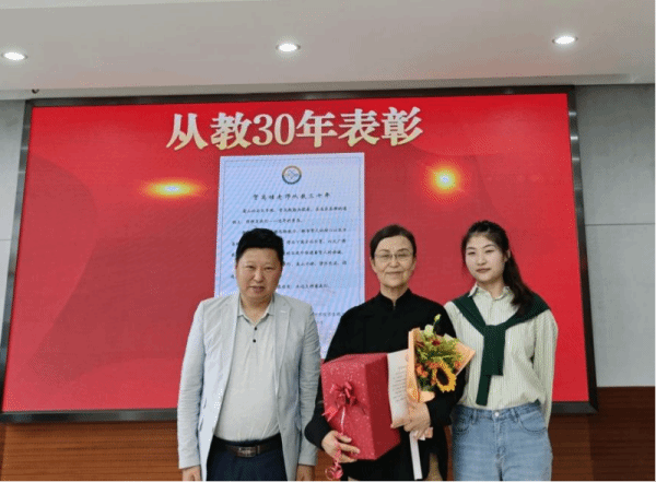 学生代表为从教三十年的教师宣读贺词并献花致敬。