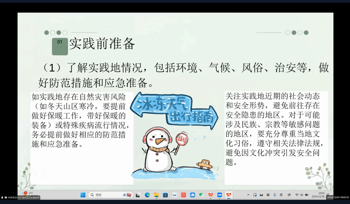 拉毛吉同学从行程安全、注意事项、网络安全等方面展开介绍,提醒同学们购买保险、注意个人信息安全,同时在实践中遵纪守法,保持良好心态。康跃南老师进行总结,鼓励同学们参与实践,积累经验、锻炼能力,为未来打基础。