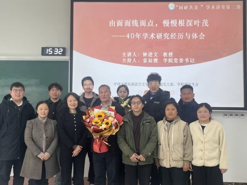 党委书记袁辰霞主持。钟进文教授以“由面而线而点,慢慢根深叶茂” 为主题,深情回顾了自己四十载深耕文学研究与语言研究领域的学术历程,将一路的宝贵经验与深刻感悟倾囊相授。他着重指出,在学术研究中,精准捕捉关键点是深入探索的关键,一旦找准方向,便要持之以恒、深耕细作。同时,钟教授强调了守正创新的重要性,鼓励大家紧跟时代步伐,不断提升科研实力,积极拥抱学术前沿。着眼当下,他特别提出,要紧紧围绕铸牢中华民族共同体意识这一主线,深度聚焦“共同性”展开研究,为学科发展注入新的活力与内涵。