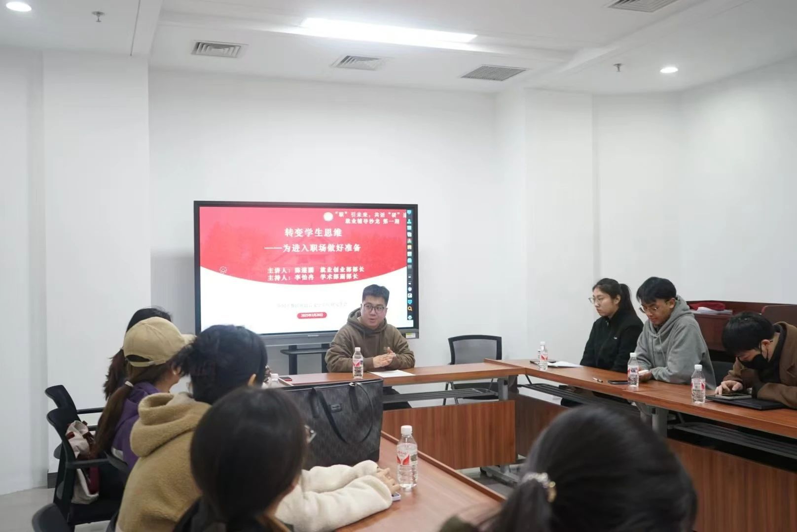 本期沙龙主题为《转变学生思维——为进入职场做好准备》,由求职经验丰富,曾在企事业单位工作并具有非洲外派经历的陈遵鹏同学担任主讲,李怡冉同学主持。
