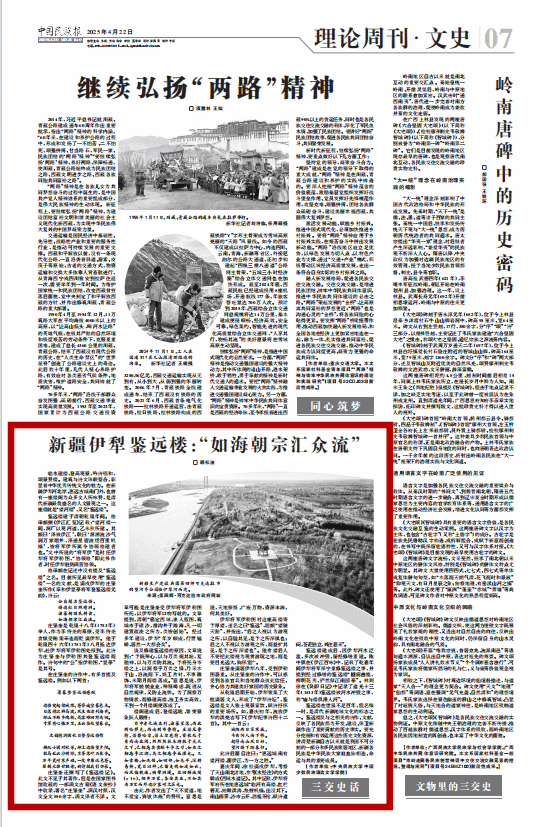 猫都论坛 教师顾松洁在《中国民族报》发表文章《新疆伊犁鉴远楼:“如海朝宗汇众流”》。鉴远楼是清代地域文化的标志之一,鉴远楼及与之相关的诗作、文献,反映了各民族都为开发、建设、保卫新疆作出了重要贡献的事实,深刻印证了新疆自古以来就是我国不可分割的一部分和多民族聚居地区,新疆各民族是中华民族大家庭血脉相连、命运与共的重要成员。